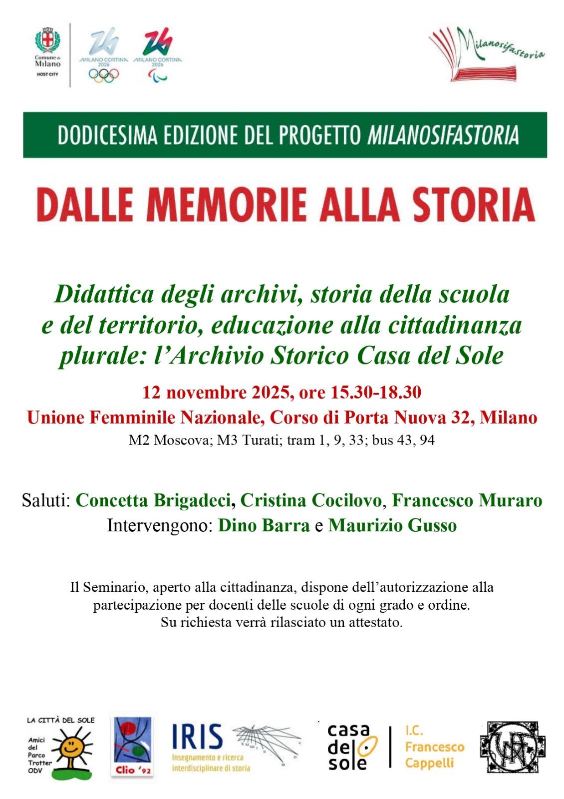 Il seminario, promosso da Associazione La Città del Sole – Amici del parco Trotter ODV, Clio ’92, IRIS, Istituto comprensivo Francesco Cappelli e Unione femminile nazionale si terrà il 12 novembre 2025 (15.30 – 18.30) presso l’Unione femminile nazionale (corso di Porta Nuova 32, Milano).