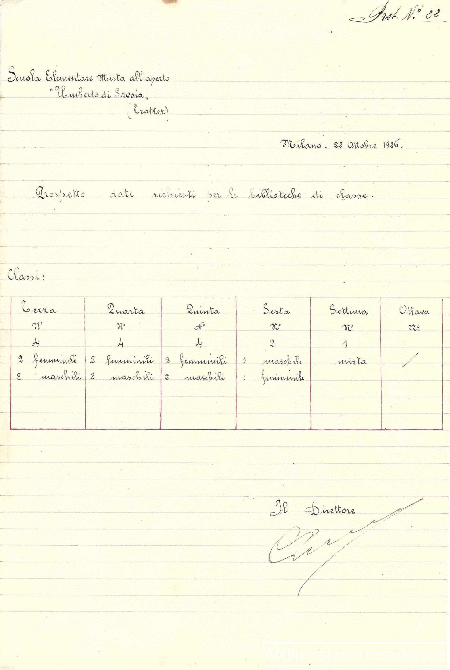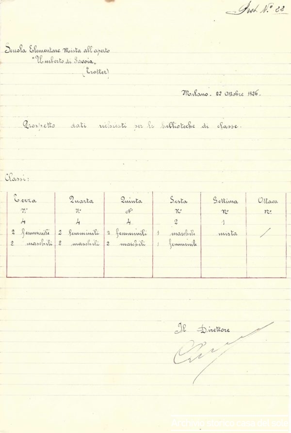 / Prospetto biblioteche di classe, 1926