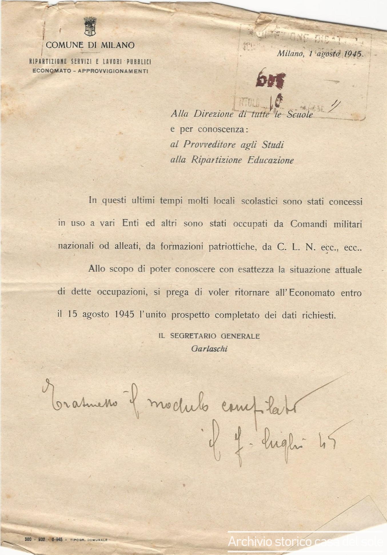 Prospetto con le informazioni riguardanti i locali occupati, compilato dal direttore didattico nell’agosto 1945 su richiesta del Comune di Milano: nella scuola all’aperto “Padre Reginaldo Giuliani” (secondo la nuova intitolazione sancita l’11 gennaio 1944) uno dei due solari situati nel parco risulta occupato dal Comitato di assistenza interna e adibito a danze.