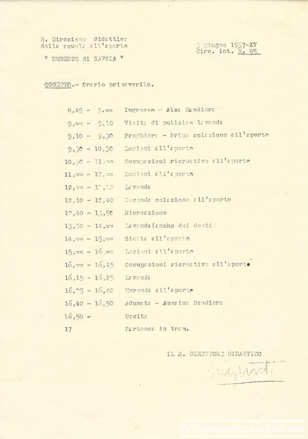 Orario primaverile e invernale della scuola all’aperto “Umberto di Savoia” nel 1937.