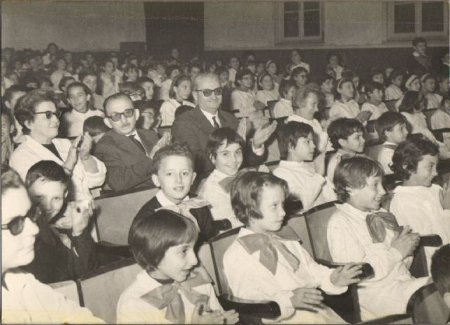 Descrizione breve31 ottobre 1964, giornata del risparmio. Il preside della scuola all'aperto "Casa del Sole" (a sinistra) e il Dr. Massimiliano Rossi della Cassa di Risparmio delle Provincie Lombarde (a destra), seduti all'interno del teatrino della scuola tra gli alunni vestiti con la tenuta scolastica. Sono presenti, sedute accanto al preside e al Dr. Rossi, anche due donne non identificate. |