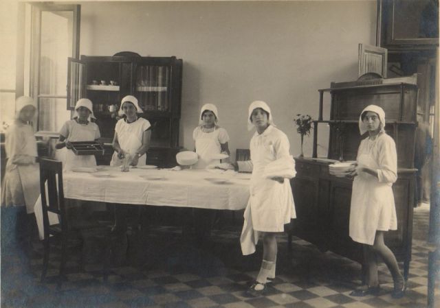Descrizione breveEconomia domestica. Alunne della classe di economia domestica apparecchiano il tavolo della sala da pranzo. |