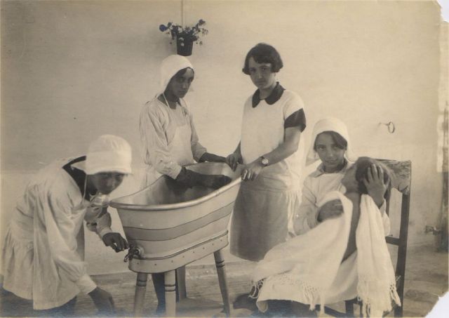 Descrizione breveEconomia domestica. Le alunne della classe di economia domestica si prendono cura dei bambini piccoli: asciugatura della bimba e pulizia della vasca dopo il bagnetto. |