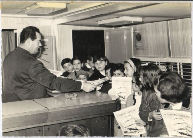 Descrizione breve31 ottobre 1964, giornata del risparmio. Un funzionario della Cassa di Risparmio delle Provincie Lombarde distribuisce opuscoli informativi sulla Cassa di Risparmio agli scolari in visita all'auto-banca (della Cassa di Risparmio). La copertina dell'opuscolo reca l'immagine di un veliero in mezzo al mare e la scritta "UN DECENNIO A GONFIE VELE". Su un manifesto appeso all'interno dell'auto banca, sulla sinistra, è leggibile la scritta "denaro quanta fatica hai fatto per guadagnarlo!". |