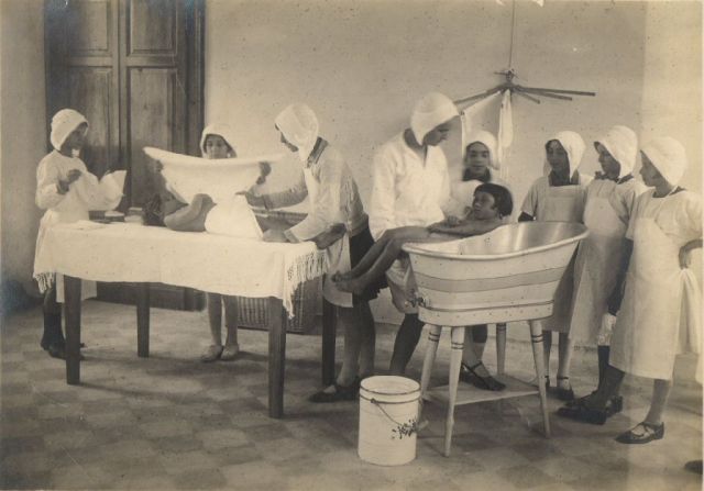Descrizione breveEconomia domestica. Le alunne della classe di economia domestica si prendono cura dei bambini piccoli: si impara a lavare e fasciare sotto la guida di un'insegnante. |