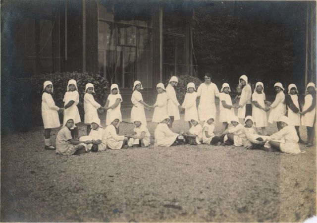 Descrizione breveEconomia domestica. Foto di gruppo di una classe di economia domestica davanti al solarium. |