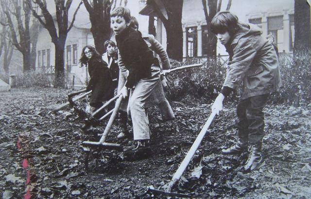Bambini rastrellano le foglie davanti al Padiglione Gabelli.