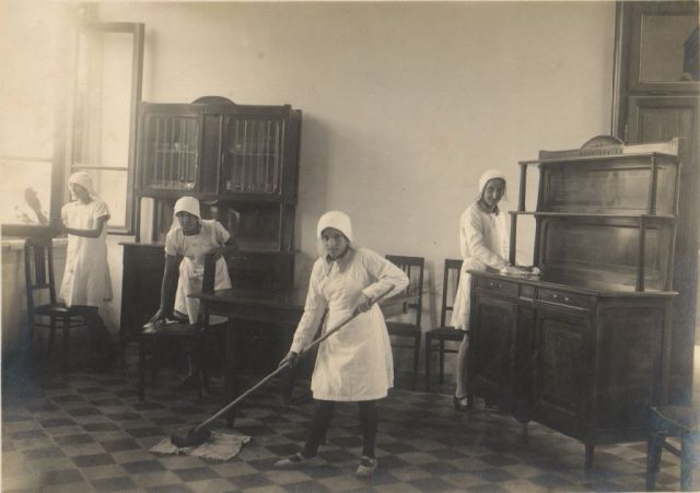 Descrizione breveEconomia domestica. Alunne della classe di economia domestica impegnate nella pulizia della sala da pranzo. |